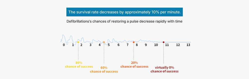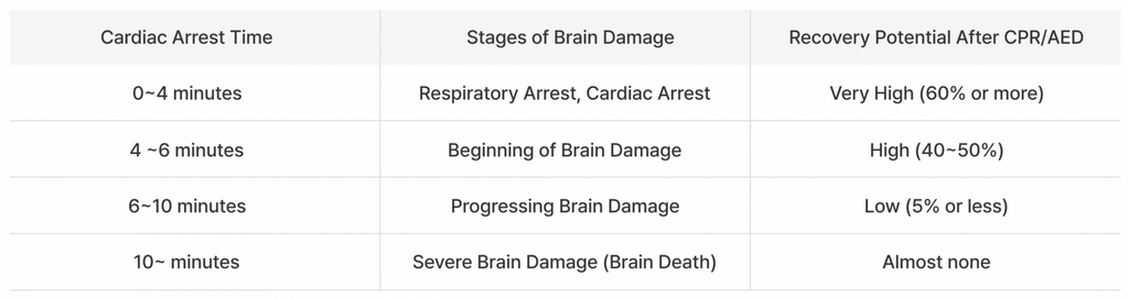 In the event of cardiac arrest, the heart stops, and oxygen is no longer supplied to the brain and heart. Without prompt treatment, brain damage begins within 4 minutes, and death can occur within 10 minutes. To prevent heart damage and brain death in emergency situations, early CPR (Cardiopulmonary Resuscitation) and the use of an AED (Automatic External Defibrillator) are crucial. Without them, the survival rate decreases by approximately 7-10% for every minute that passes beyond 5 minutes.